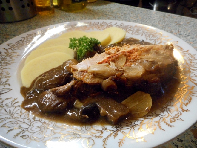 Pak vyděláme maso stranou a zaprášíme výpek hladkou moukou, popřípadě dokořeníme dle chuti.Podáváme s bramborovým knedlíkem, nebo je vařenými bramborami.
