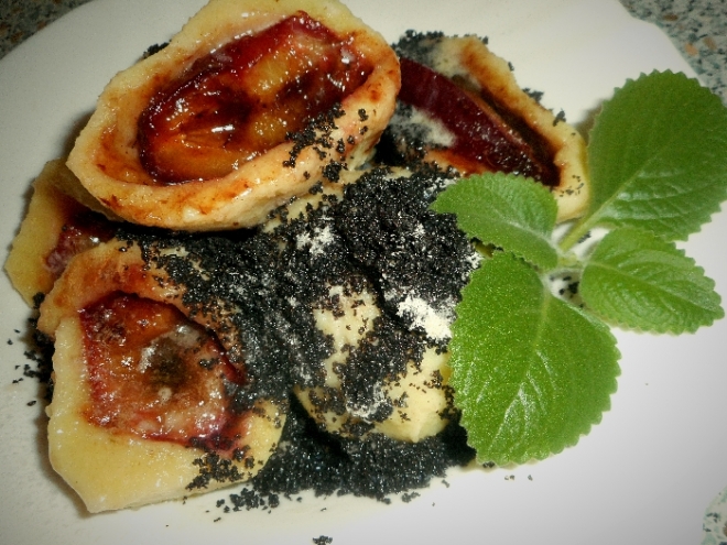 V míse smícháme mouku se solí, přistrouháme studené brambory, přidáme žloutek a opatrně vypracujeme vláčné těsto (mícháme ho jen dokud se suroviny nespojí) Vytvarujeme si váleček , nakrájíme stejně velké díly, do kterých balíme vypeckované ovoce .Do každého kousku ovoce místo pecky dáme lžičku povidel a zamotáme do těsta. Uvaříme ve slané vodě, okolo 15.minut Na talíři sypeme strouhanou tatrankou, mákem a polejeme máslem.