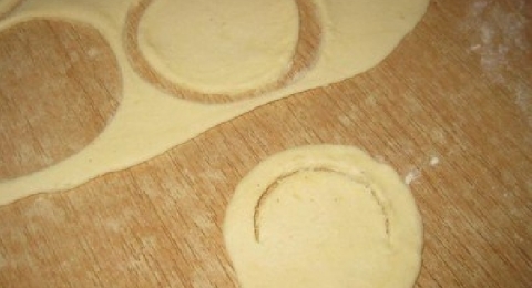 potom vyvaľkáme na pomúčenej doske a pohárom vykrojíme kruh.ten v strede do polovice prerežeme na rúčku..