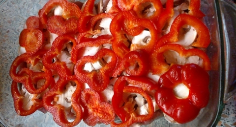 Brambory si oloupeme, propereme a nakrájíme na tenké kolečka. Dno pekáčku vyložíme plátky masa, osolíme a opepříme. na maso nakrájíme žampiony a papriku.