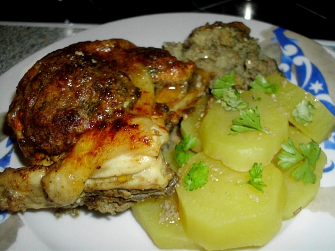 Pečeme podlité vodou , středně asi 3/4 hodiny. Pak nadzvedneme kousky a přidáme další nádivku, když nám ještě zbyde, dáme kam se vejde a pečeme dále přes půl hodiny, do zlatova.