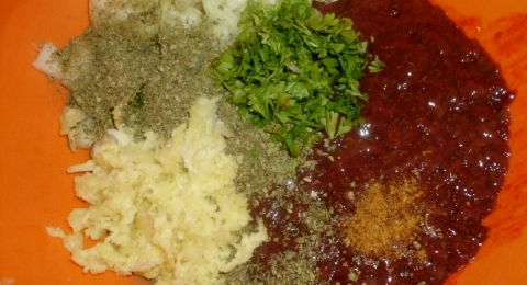 přidáme žloutky, koření, nasekanou nať, cibuli, česnek,
