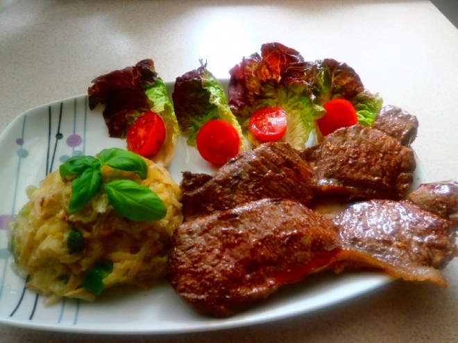 Roštěná z mladého býka.Maso jsem si naložil den předem do pepře a oleje,nesolit a napíchat do masa vidličkou. Maso osmahneme 1 min po každé straně na velmi rozpálené kvalitní nepřilnavé pánvi s masivním dnem (vroubkovaná být nemusí).Maso Potřeme hrubozrnoů hořčici a vložíme do vyhřáté trouby Čas a propečenost se tedy měří právě na základě výšky masa. 2,5cm chce Pak 10 min v troubě na stav rare, 13 min na medium rare až medium, 15 minut na lehké růžovění uprostřed, tedy medium well. 4 cm by si žádaly 1,5 min po každé straně a následně cca 15 min rare, 18 medium rare, 20-22 medium well. 150 stupňů zůstává. Na konec maso posolíme. Gratinované brambory, nastrouháte brambory přidáte česnek drcený kmín sůl promícháte vložíte do vymazaných misek máslem a zalijete smetanou pečete 25 minut na 200 stupňů