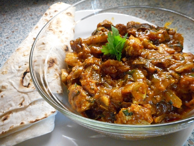 Poté přidáme koriandr, římský kmín, hřebíček, sladké chilli a kurkumu a podusíme ještě asi 1 minutu. Do směsi přidáme marinované prsa a restujeme po všech stranách. Podle chuti dochutíme solí. Po zhnědnutí masa přidáme oloupaná nakrájená rajčata, papriku, mírně podlijeme a přivedeme k varu, přikryjeme pokličkou a dusíme zhruba 45 minut, dokud kuře zcela nezměkne.