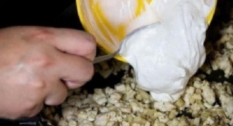 Zmiešajte múku a kyslú smotanu.Primiešajte ku kuracej zmesi a oheň trochu stiahnite . Dochuťte soľou a korením a duste ďalších 5 minút. Zmes by mala zhustnúť.Potom nechajte vychladnúť.