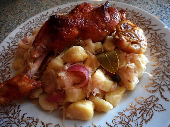 Každé kuřecí stehno nařízneme na třech místech a vsuneme kousek špeku. Naskládáme do pekáčku, zasypeme nakrájenou cibulkou, rozpůlenou paličkou česneku položíme mezi maso. Opepříme, podlijeme vodou a pečeme zakryté přes půl hodiny. Pak asi 10 minut odkryté dopečeme. Na oleji si osmahneme cibulku nakrájenou s cukrem, do zlatova. Přidáme kysané zelí, podle chuti přidáme dané koření. Podlijeme vodou a dusíme asi půl hodiny, nakonec přidáme nastrouhané brambory ze kterých vymačkáme přebytečnou vodu a dovaříme za stálého míchání asi 5 minut. Podáváme s bramborovými špalíčky, nebo knedlíky.